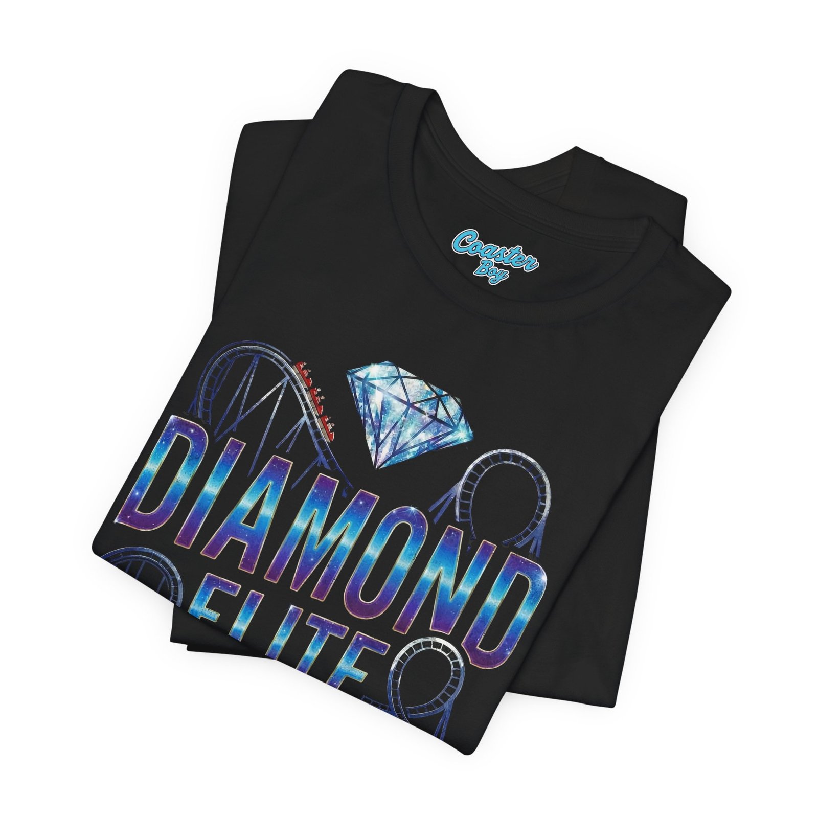 This soft, breathable jersey tee brings a bold, retro-arcade energy to everyday wear. The front graphic reads “Diamond Elite V.I.P. Member” in shimmering, jewel-toned lettering with roller-coaster silhouettes and a sparkling diamond accent — a look that feels like a backstage pass to nostalgia and high-energy nights out. Lightweight Airlume combed cotton gives the shirt a smooth hand and comfortable drape, while the ribbed crew neck and side seams keep the fit structured through repeated wear. It layers easily under jackets or stands alone as a statement piece for fans of vintage signage, amusement-park vibes, or anyone who likes their casual wear a little flashy and confident.